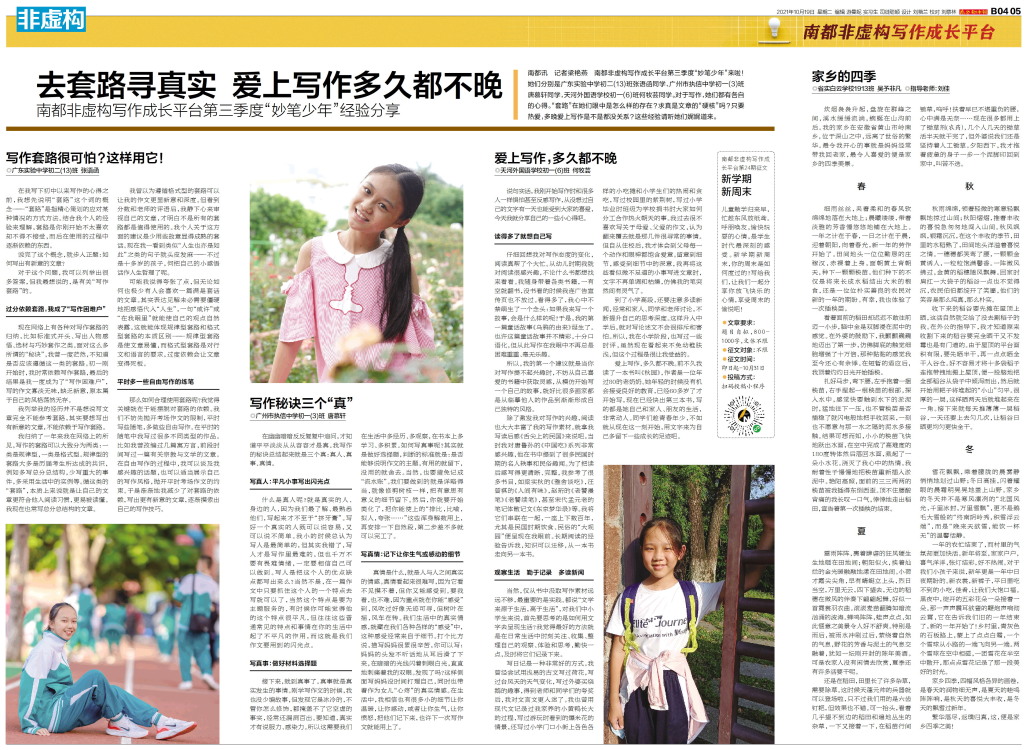 南都讯 记者梁艳燕 南都非虚构写作成长平台第三季度“妙笔少年”来啦!她们分别是广东实验中学初二(13)班张语函同学、广州市执信中学初一(3)班唐慕轩同学,天河外国语学校初一(6)班何牧芸同学。对于
