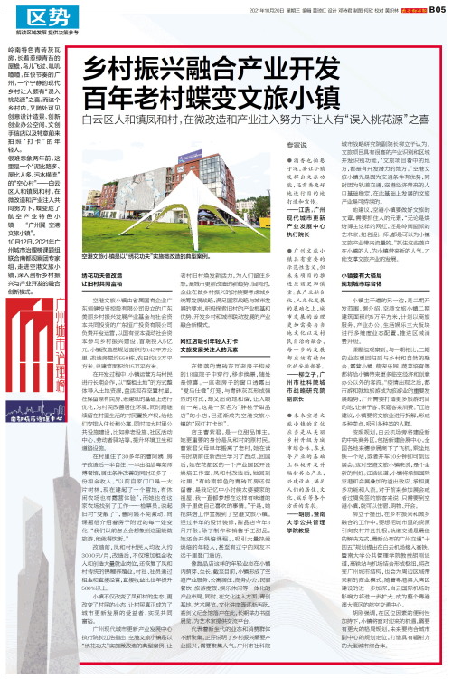 岭南特色青砖灰瓦房,长着葱绿青苔的屋檐,鸟儿飞过、叽叽喳喳,在快节奏的广州,一个宁静的现代乡村让人颇有“误入桃花源”之喜。而这个乡村内,又随处可见创意设计造景、创新创业办公空间、文创手信店以及特意
