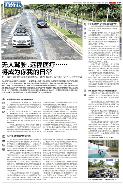 无人驾驶汽车、远程医疗、虚拟现实……随着5G技术与各行各业深度融合,5G的应用场景加速走进人们的日常生活。在广州,5G逐渐渗透到市民衣食住行等不同领域,例如智慧医疗、智慧交通、智慧政务、智慧教育等