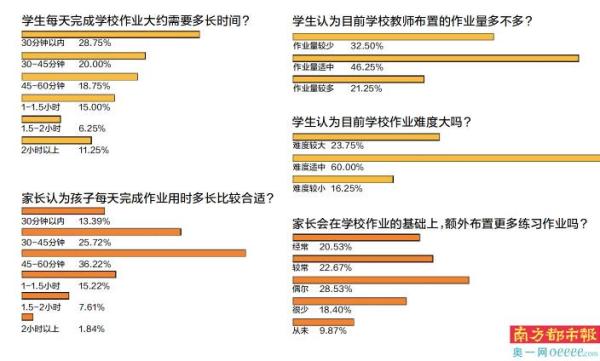 学生、家长和教师认为目前的校内作业总量、类型、难度、完成时间是否合适?对校内作业设计与实施有哪些看法和建议?南都民调中心社会调查与公共舆情研究课题组于10月12日-18日就该话题发起问卷调查,并于近日发布《广州义务教育阶段“减作业”情况调查报告》。调查结果显示,超七成受访学生的作业完成时间未超出《指引》要求范围;但仍有四成受访家长表示常被要求检查批改作业;个别教师仍存在批改作业敷衍等问题;对《指引》提出的分层设计作业等要求,有受访教师表示实际推行时存在困难。