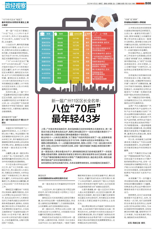 上周,广州各区两会陆续召开,各区陆续通过法定任命程序正式选举区长,新一届各区行政主官名单也由此出炉。南都记者也通过对十一名区长的履历表进行了一番大数据分析,力图挖掘他们群体画像里的个性和亮点。新出