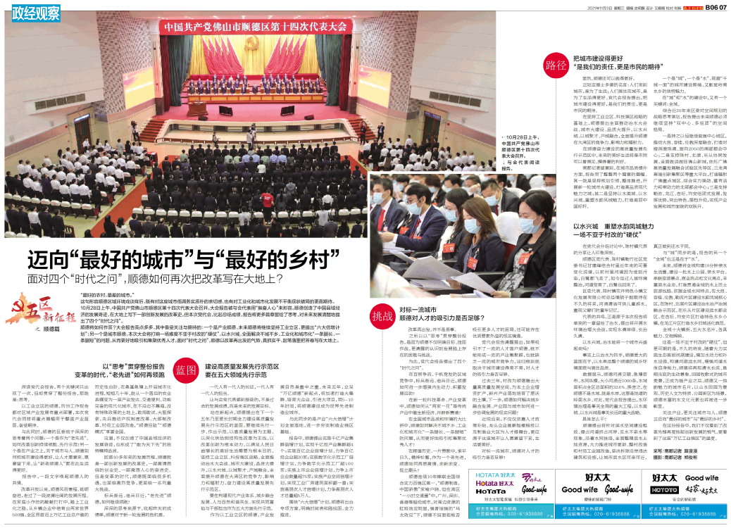 顺德篇 “最好的农村,最差的城市。”这句形容顺德区域环境戏谈背后,既有对这座城市低调务实质朴的亲切感,也有对工业化和城市化发展不平衡现状破局的更高期待。10月28日上午,中国共产党佛山市顺德区第