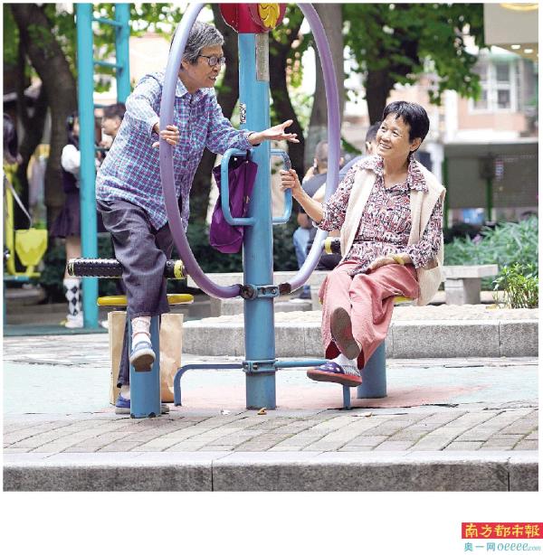 老住户打牌叹茶 老人在小区内锻炼身体。