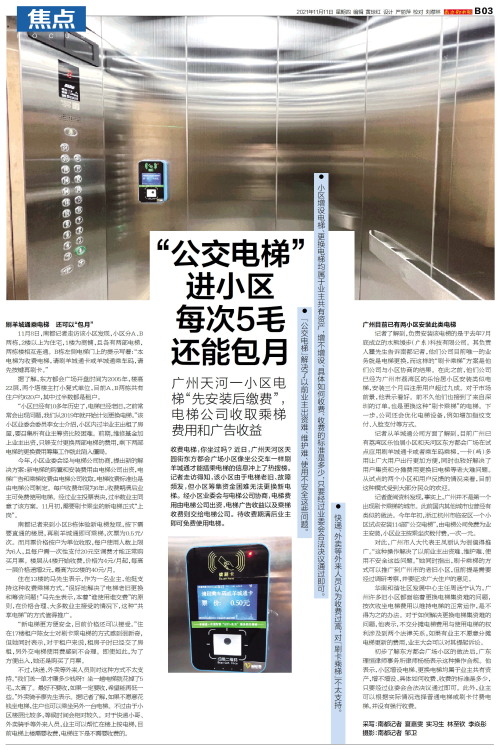 收费电梯,你坐过吗?近日,广州天河区天园街东方都会广场小区像坐公交车一样刷羊城通才能搭乘电梯的信息冲上了热搜榜。记者走访得知,该小区由于电梯老旧、故障频发,但小区筹集资金困难无法更换新电梯。经小区业委会与电梯公司协商,电梯费用由电梯公司出资,电梯广告收益以及乘梯收费则交给电梯公司。待收费期满后业主即可免费使用电梯。