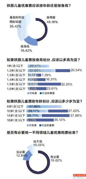 再问及可购买优惠票的身高区间,20.54%认为1.2米(含)以下儿童可以购买优惠票,7.29%认为1.3米(含)以下儿童可享受优待,16.31%认为1.4米(含)以下儿童可买优惠票,32.25%认为1.5米(含)以下儿童可买优惠票,还有23.61%希望1.6米(含)以下儿童均享受优待。
