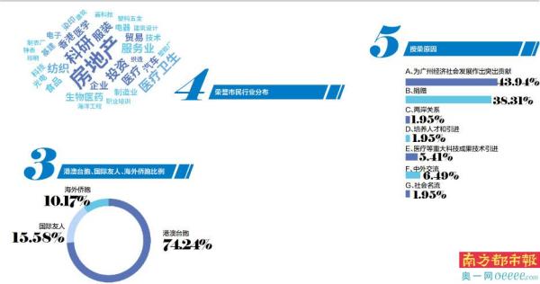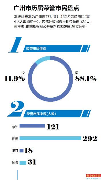 南都记者根据公开资料统计发现,在十七批荣誉市民中,港澳台胞共343人,占74.24%。不少广州市民熟悉的港澳名流,如已故的何鸿燊、霍英东、马万祺、曾宪梓等人,都是广州荣誉市民。在462位荣誉市民中,有父子、夫妻、兄弟、姐妹,还有子孙三代都是荣誉市民的。荣誉在传承,在广州的建设也代代相传。如第十七批荣誉市民中,第十三届全国人大代表何敬麟,是澳门何氏家族第四代传人,其叔叔何厚铧等人都曾获得广州市荣誉市民称号。