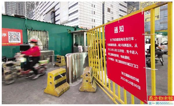 11月16日下午,记者在珠江国际纺织城正门(南门)看到,虽有保安守在门口,但无人查验电动车,许多送货的电动车已经可以自由进入。正门张贴的通知还在,落款是珠江国际纺织城:“为了有效管控电动自行车,杜绝消防隐患,减少车辆丢失。从2021年11月1日(注:原为1日,后被改为15日)开始,凭卡进入珠江国际纺织城。”