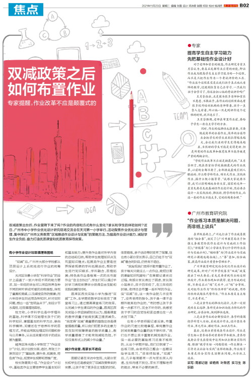 双减政策出台后,作业量降下来了吗?作业的内容和方式有什么变化?家长和学生的体验如何?近日,广州市中小学作业优化设计研究现场交流会在天河第一小学举行。活动聚焦作业优化设计与管理,集中探讨广州市义务教