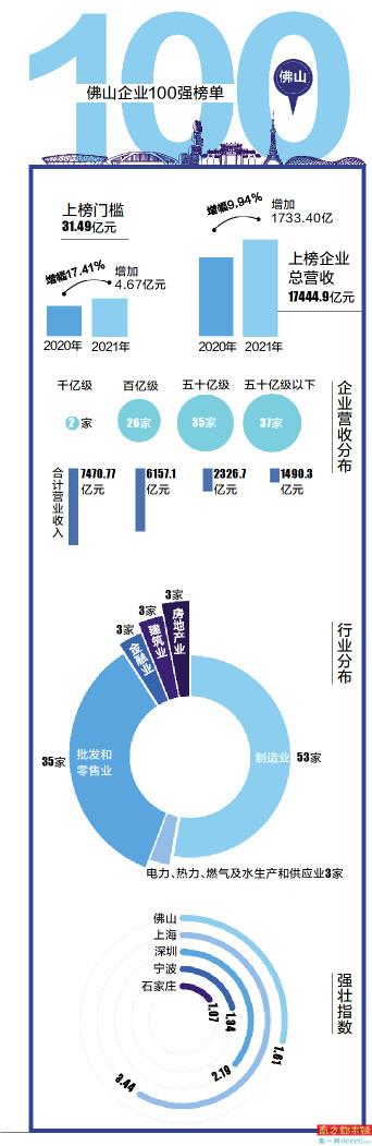 榜单显示,2021年,佛山企业100强的入榜门槛为31.49亿元营业收入,比2020年提高了4.67亿元,増幅17.41%。2021年佛山企业100强入榜企业总营业收入为17444.9亿元,比2020年增加1733.40亿元,提高9.94%。两项数据均创历史新高。