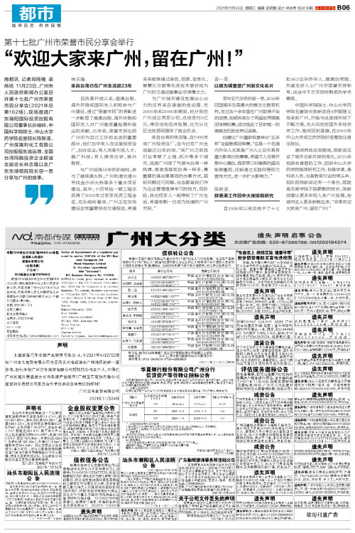 南都讯 记者郑雨楠 梁炜培 11月23日,广州市人民政府新闻办公室召开第十七批广州市荣誉市民分享会(2021年总第162场),现场邀请广东瀚阳国际投资控股有限公司董事长孙峻岭,中国科学院院士、中山