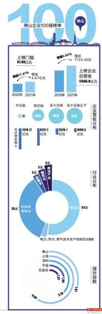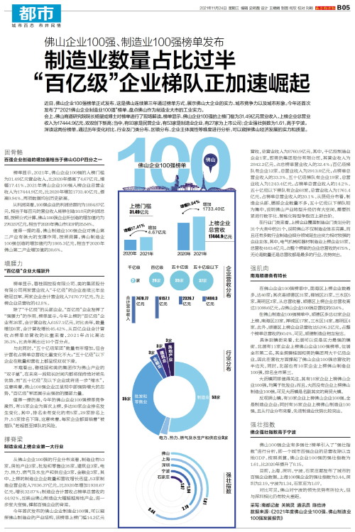 近日,佛山企业100强榜单正式发布,这是佛山连续第三年通过榜单方式,展示佛山大企业的实力、城市竞争力以及城市形象。今年还首次发布了“2021佛山企业制造业100强”榜单,盘点佛山作为制造业大市的工