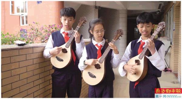 广州市培正中学澳门籍学生胡珀玮(右)、胡珀诚(左)和穗籍学生史卓鑫一同弹奏鸣鸠琴。