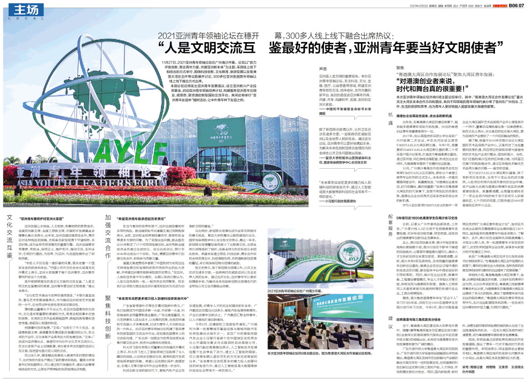 11月27日,2021亚洲青年领袖论坛在广州南沙开幕。论坛以“致力开放创新,聚合青年力量,共建亚洲新未来”为主题,采用线上线下相结合的方式举行,围绕科技创新、文化教育、旅游发展以及粤港澳大湾区合作