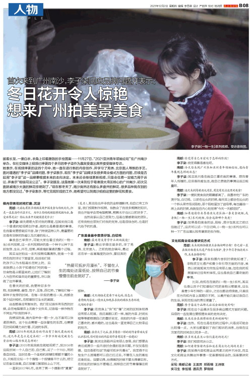 “热爱可抵岁月漫长”。不管在人生的高处还是低处,按照自己的节奏慢慢往前走就好了。——李子柒 披着长发,一袭白衣,衣角上印着雅致的手绘图案……11月27日,“2021亚洲青年领袖论坛”在广州南沙举