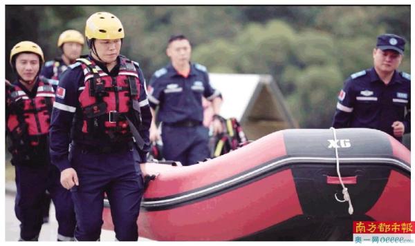 “123,起!”十几名身穿深蓝色队服的队员们同步抬起3艘冲锋舟往水库走去。十分钟后,位于广州市花都区的芙蓉水库内,一场水域救援实战训练正式开始。