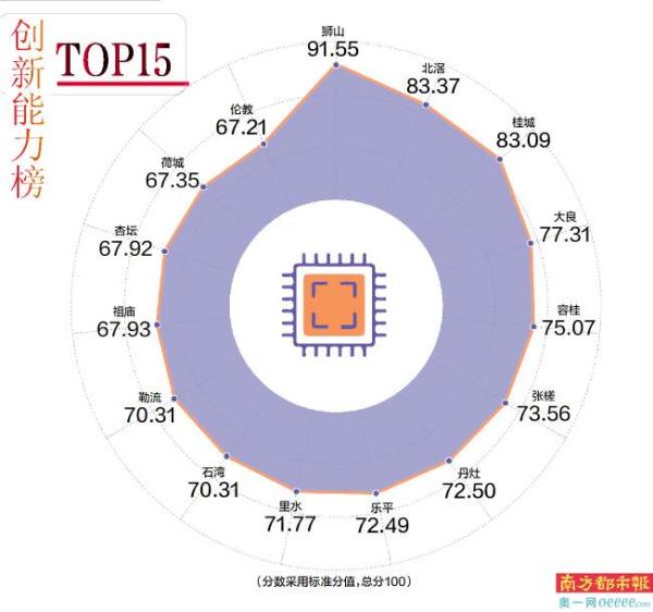 在佛山“镇能量”榜创新能力这一维度上,顺德区和南海区表现抢眼,分别有6个和4个镇街上榜TOP15;而禅城区的上榜镇街达到3个,上榜比例高居75%。