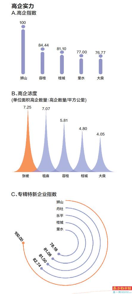 但从各个镇街的高企浓度来看,张槎、祖庙分别以每平方公里拥有7.25家和7.07家高企,位居一、二名。随后是容桂和桂城,狮山镇仅为2.83家。可见在创新方面仍有很大的发展空间。