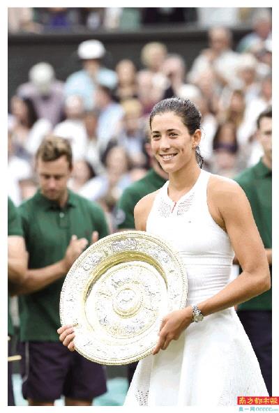 劳力士代言人加尔比妮·穆古拉扎手捧温布尔登网球锦标赛女单冠军奖杯玫瑰露水盘。 © Rolex/Gianni Ciaccia