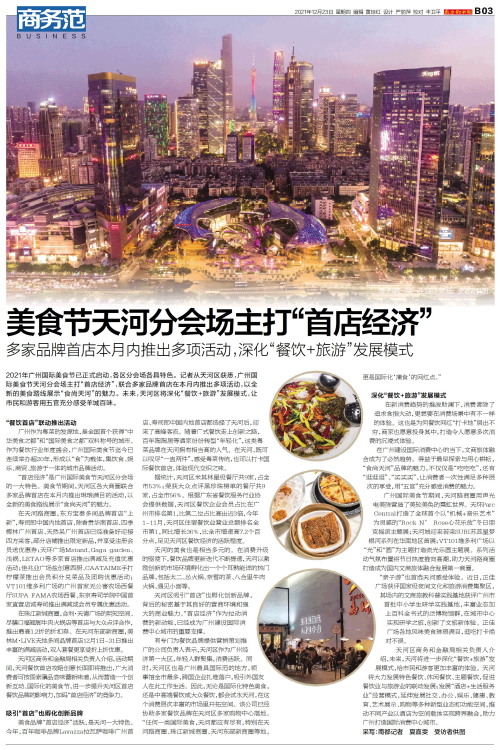 2021年广州国际美食节已正式启动,各区分会场各具特色。记者从天河区获悉,广州国际美食节天河分会场主打“首店经济”,联合多家品牌首店在本月内推出多项活动,以全新的美食路线展示“食尚天河”的魅力。未