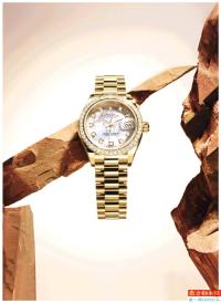 女装日志型18ct黄金款,外圈镶46颗圆形切割钻石,白色珍珠母表盘镶10颗钻石。 © Rolex/Ulysse Fréchelin 劳力士挑选的