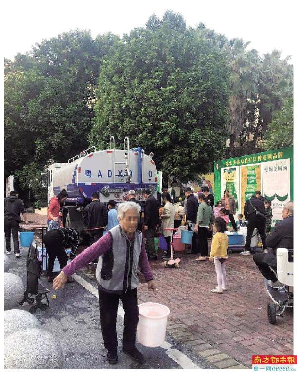 ↑停水后,供水车前排着长队,老人家正提着桶往家里搬水。