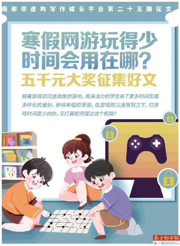 南都讯 记者孙小鹏 讲述游戏防沉迷好故事,引领智慧成长新风尚!南方都市报在南都非虚构写作成长平台发起,以“寒假网游玩得少 时间会用在哪?”为主题的有奖征文活动,一等奖5000元,设两个一等奖,快来参与吧。
