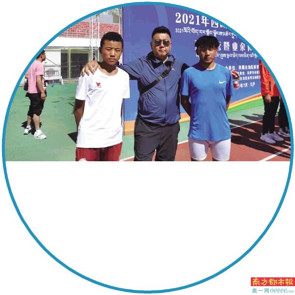林芝市广东实验小学校长、林芝市业余体校负责人金桑(中)与他的学生们。 (受访者供图)