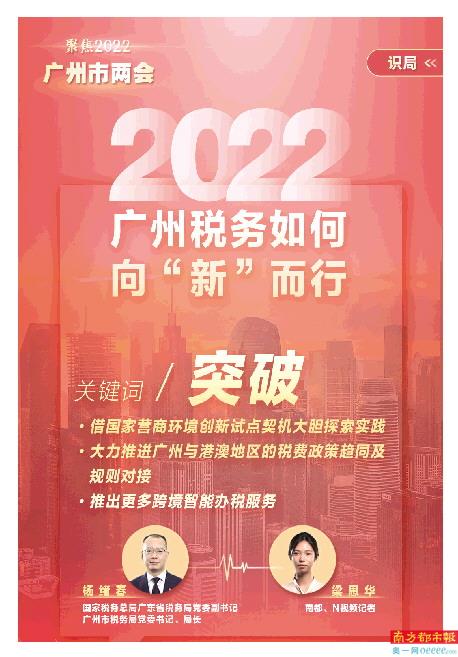 杨绪春:2022年,广州税务首先将紧抓创新试点契机,打造一流税收营商环境。广州营商环境“纳税”指标连续两年入围全国标杆城市,2021年纳税人满意度在全国也高居前列。尽管这样,我们知道与纳税人需求相比仍有距离,我们将坚持以问题为导向,制定具体实施方案,确保改革事项尽早、高质量落地实施;对标国际国内先进经验,推动打造一批有全国示范意义的税收改革创新项目。对前期行之有效并受市场主体欢迎的各项改革举措,做好总结提炼和复制推广工作。