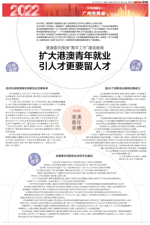 在大湾区,“港澳青年”是高频词。他们,是活跃在5.6万平方公里热土上的生力军。 在今年的广州市两会,“港澳青年”,顺理成章地成为政协委员们热议的焦点。“广州应成为香港青年在内地发展的中转站”“让