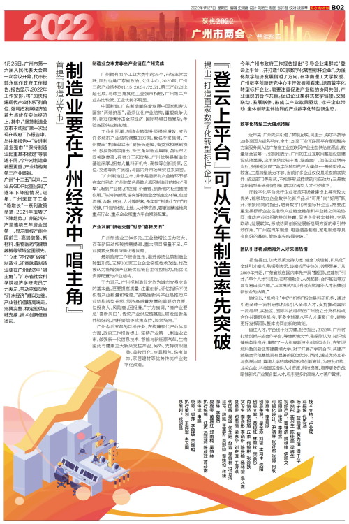 1月25日,广州市第十六届人民代表大会第一次会议开幕,代市长郭永航作政府工作报告。报告显示,2022年工作安排,将“加快构建现代产业体系”列首位,强调把发展经济的着力点放在实体经济上。其中,“坚持