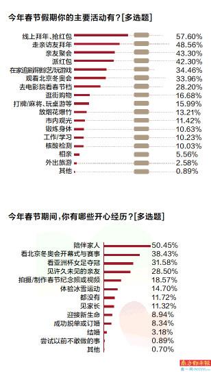 对受访者毛女士而言,春节最开心的事是家里迎来新成员。今年春节前,毛女士的小侄子出生了,春节期间除了筹备年货以及吃年夜饭之外,全家人都围绕小宝宝转,还办了一场满月宴,这个新年比以往更加喜庆欢乐。而留在北京过年的受访者夏女士这个春节最开心的事情是看冬奥会以及体验冰雪运动。夏女士表示,过年期间北京的冰雪运动氛围很浓厚,她往年也会带孩子去什刹海溜冰,今年打算体验一下滑雪,“户外雪场有点远,我就带孩子找了个室内雪场体验,有教练指导,孩子玩得很开心”。