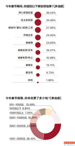 问及春节期间的烦恼,36.54%的受访者表示担心疫情反复。在北京过年的夏女士便是因为疫情原因选择就地过年。夏女士说因没能回家过年感到遗憾,“两年没回家了,希望疫情早点过去,明年能回家过年”。而在重庆工作的受访者赵女士春节期间去成都见了男友的家长,因为行程跨省,疫情成了假期最大的担忧。虽然重庆和成都没有疫情,但赵女士往返也测了4次核酸,“麻烦是一方面,更多是担心突发疫情,影响春节的计划。”