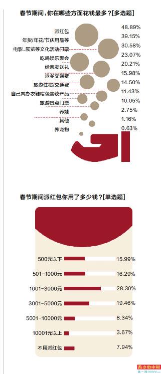 那么大家在哪些方面花钱最多?调查发现,派红包是最大的支出,占48.89%,超过了置办年货、年花和节庆用品。调查还发现,受访者在电影、展览等文化活动门票的支出较为明显,占30.58%,23.07%的受访者花费在吃喝娱乐聚会方面,20.21%表示花在给亲友送礼。
