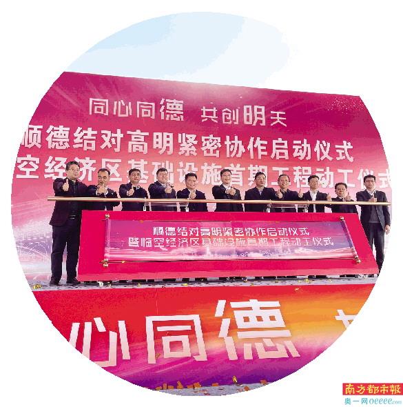 一周后,正值元宵节,佛山新一年的第二大“重头戏”——总体量约160平方公里的佛山临空经济区基础设施首期工程动工了。当天,顺德区人民政府、佛山中德工业服务区(三龙湾)管委会、高明区人民政府在高明区更合镇共同举办了“同心同德 共创明天”——顺德结对高明紧密协作启动仪式暨临空经济区基础设施首期工程动工仪式。