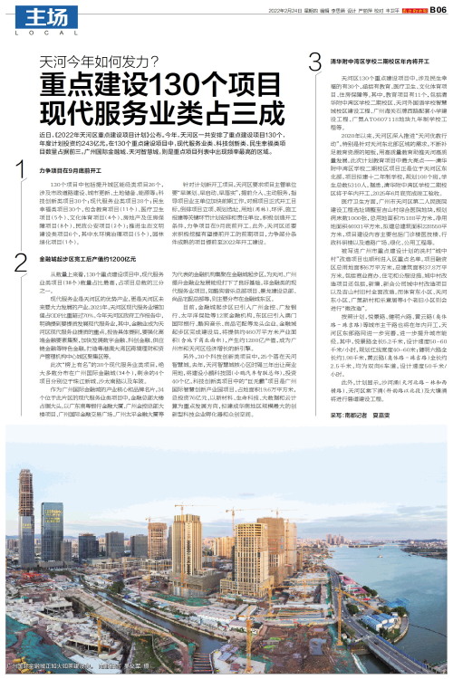 近日,《2022年天河区重点建设项目计划》公布。今年,天河区一共安排了重点建设项目130个,年度计划投资约243亿元。在130个重点建设项目中,现代服务业类、科技创新类、民生幸福类项目数量占据前三