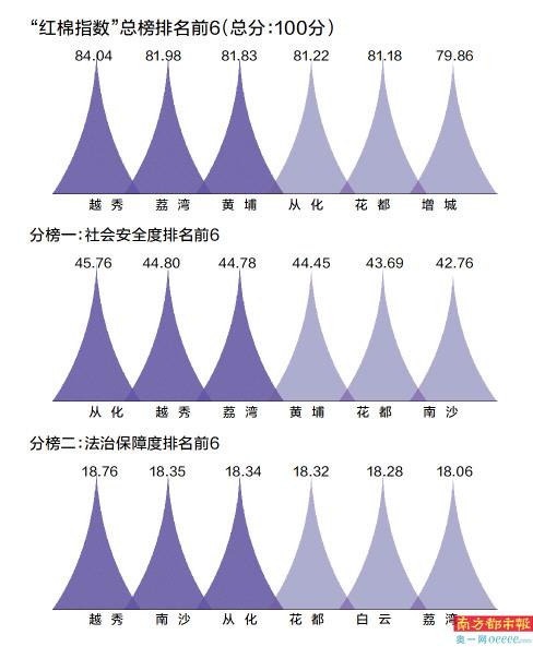 2021年度测评结果显示,在“红棉指数”一级指标社会安全度下,从化、越秀、荔湾区分别以45.76分、44.80分、44.78分位列全市前三名。