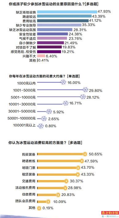报告显示:在北京冬奥会的影响和助推下,超七成受访者认为参与冰雪运动的意愿有所提升,尤其是00后、90后、80后等群体。就目前而言,八成受访者参加过冰雪运动,强身健体、兴趣爱好是主要原因,参与人群低龄化渐成趋势。玩家受访者中,超五成每年玩3-10次冰雪运动,超七成每年在冰雪运动上花费万元内,东北、华北是参与者常去玩冰雪运动的地方,滑雪、滑轮等项目备受欢迎。而非玩家受访者中,有近半人是因为周边缺乏场地设施才较少接触冰雪运动,但如果条件允许的话,有近八成表示愿意体验或带孩子体验冰雪运动。近七成受访者认为冰雪运动消费高,特别是购买装备方面,开销较大。