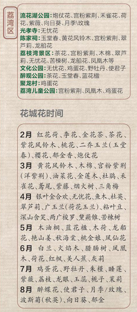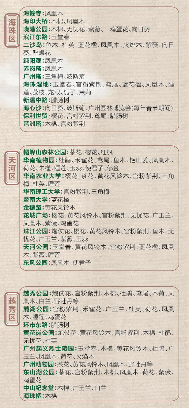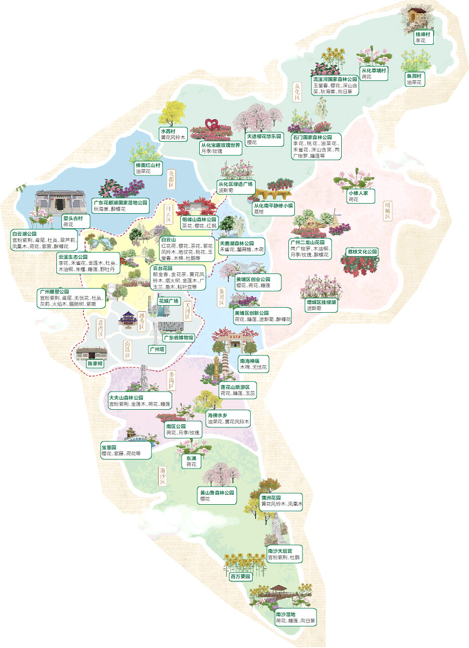 与以往版本不同,此次推出的赏花地图分为春夏版和秋冬版两部分。从空间上,赏花地图囊括了广州各大公园、主要路段、旅游景区的开花点,并标注了开花的品种和花期。而且,为方便市民游客“按图索花”,畅游花城,还特别设计了全域地图和局部地图。局部地图更为详细地展示了荔湾、海珠、越秀、天河、白云区等赏花点较为密集的区域。