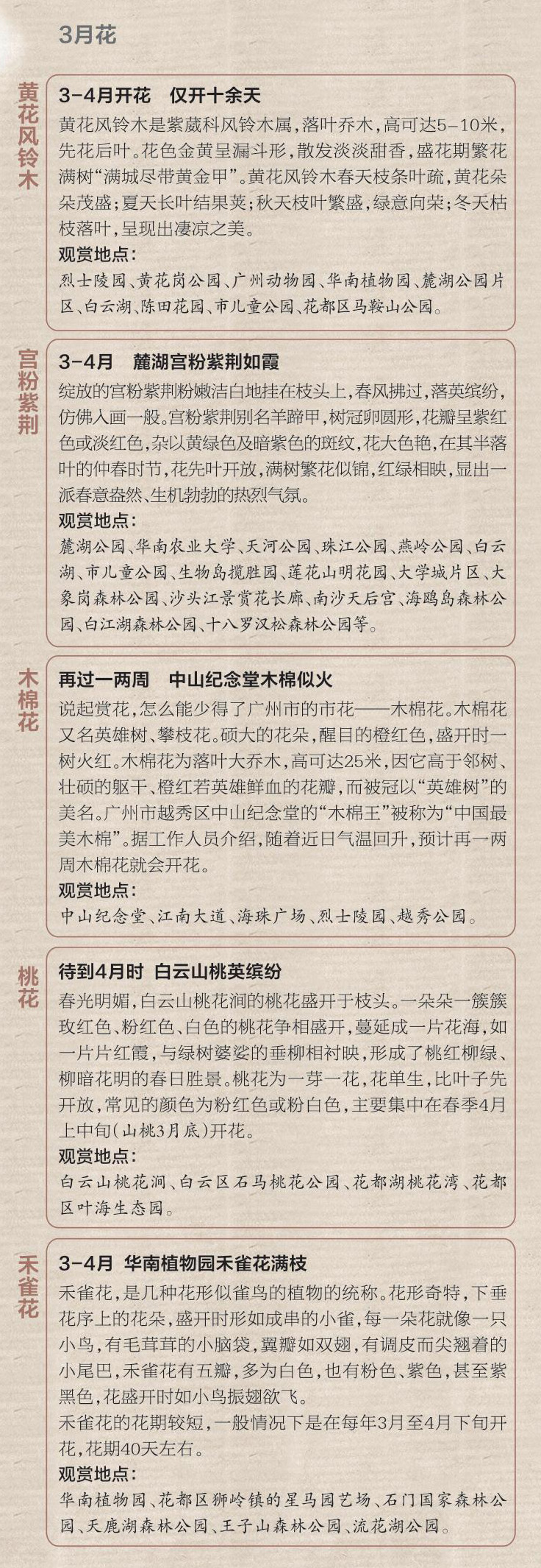 此外,针对广州特色的观花植物,如禾雀花、宫粉紫荆、木棉、腊肠树等,赏花地图还专门用小卡片的形式告诉大家什么时候在什么地方,是观赏它们的最佳时间和地点。 采写:南都记者 夏嘉雯 实习生 温文熹 廖尹瑄