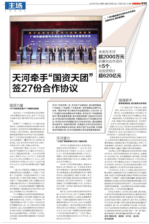 作为广州经济第一区,天河区产业基础好,吸引越秀集团、广州城投、广州发展、广州金控等一批市属国企深耕于此。未来,“国资天团”的力量在天河或越发强大。2月25日,在广州(国际)科技成果转化天河基地,天