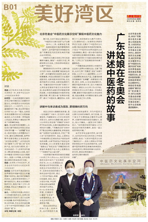 北京冬奥会期间,来自广药集团王老吉大健康公司的赵莉莹、王老吉药业的徐凡来到北京冬奥会主媒体中心,担任中医药文化讲解员。她们在冬奥会主媒体中心的“中医药文化展示空间”向来自世界各地的媒体朋友传播中医