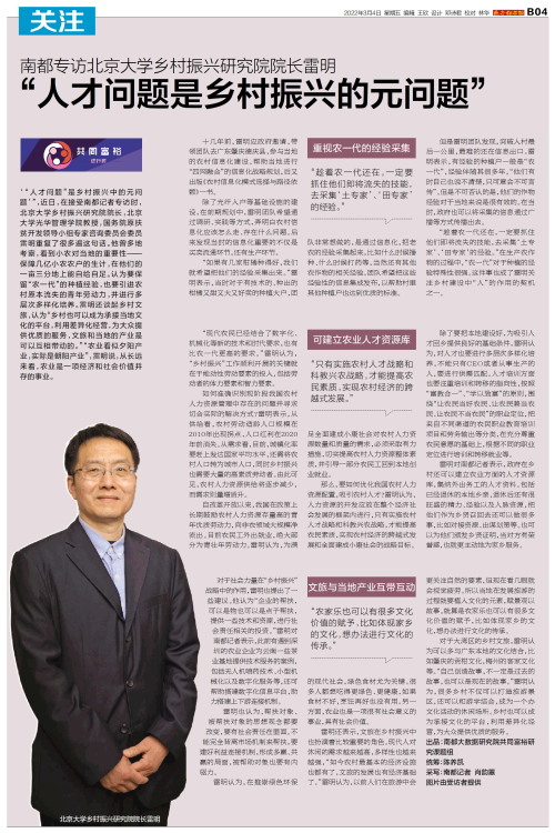 ‘“人才问题”是乡村振兴中的元问题’”,近日,在接受南都记者专访时,北京大学乡村振兴研究院院长,北京大学光华管理学院教授,国务院原扶贫开发领导小组专家咨询委员会委员雷明重复了很多遍这句话。他曾多地