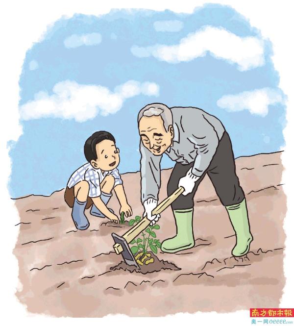 终于到了最后一道工序——播种。我们每个人都拿一小盆花生种子和一根木棍子,各自选一列地工作起来。参照爷爷的操作,一列地种三行,间距20厘米左右用棍子在土里戳个小坑,然后放两三粒花生种子在坑里,最后覆土把花生种子盖住,爷爷说这样可以防止老鼠、小鸟偷吃花生种子,还可以让种子充分吸收土里的养分更好地生长。这样的操作不断重复,弄完一列地后我便腰酸背痛不已,这时我才明白,爷爷奶奶的背为什么会变驼了,想到自己每次完成作业后理所当然地玩手机游戏,不懂得珍惜当下的优越条件而感到汗颜……