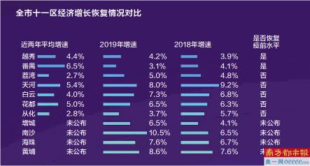 由于目前并不是每个区都公布了过去两年的平均增速,因此暂时只有越秀和番禺在这一指标上表现良好,在其他公布了数据的区里,天河过去两年平均增速为5.4%,而2019年增速为8.0%,2018年9.2%,差距还比较明显;花都过去两年平均增速为5.0%,而2019年为6.5%,2018年为6.3%,离疫情前状态也还有差距。