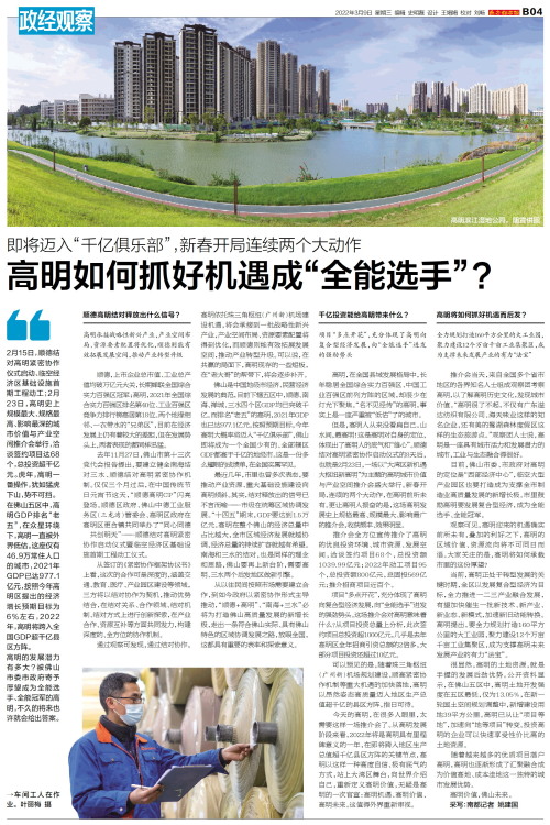2月15日,顺德结对高明紧密协作仪式启动、临空经济区基础设施首期工程动工;2月23日,高明史上规模最大、规格最高、影响最深的城市价值与产业空间推介会举行,洽谈签约项目达68个,总投资超千亿元。虎年