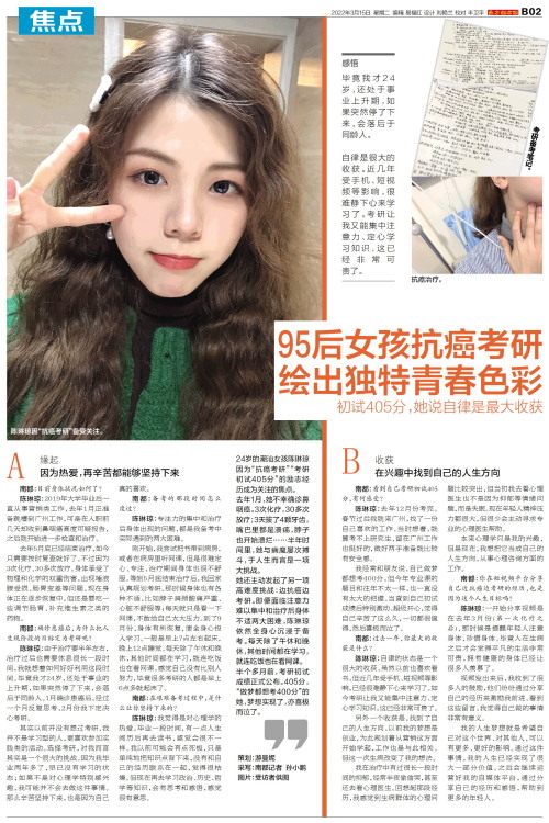 24岁的潮汕女孩陈琳琼因为“抗癌考研”“考研初试405分”的励志经历成为关注的焦点。去年1月,她不幸确诊鼻咽癌。3次化疗,30多次放疗;3天拔了4颗牙齿,嘴巴里都是溃疡,脖子也开始溃烂……半年时间