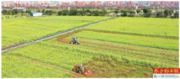 广州市黄埔区大吉沙岛的160亩隆平试验田开耕,图中为拖拉机在推平油菜花,将其翻入土中回填育肥。