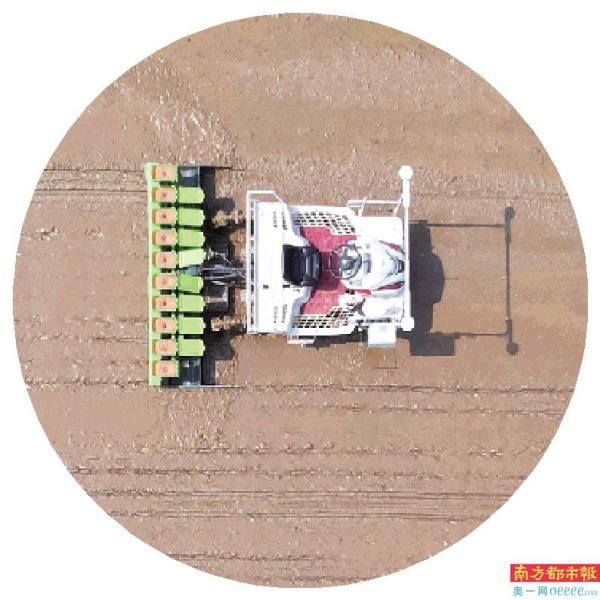 在大吉沙岛的智慧农场,两台无人驾驶水稻精量水穴直播机和水稻精量旱直播机按照预设路线在水田上来回穿梭,稻种均匀播撒在泥土里。这是无人农场春耕作业演示的一幕,也是黄埔区科技农业发展成果的一次生动展示。