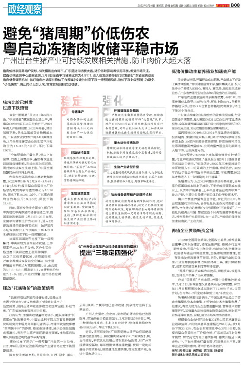 猪肉价格亲民养殖户发愁,相关措施出台稳市。广东是猪肉消费大省,猪价涨跌影响着供需平衡,备受市场关注。据省价格监测中心最新监测,3月8日全省平均猪粮比价为4.91:1,进入省发改委等部门印发的《广东