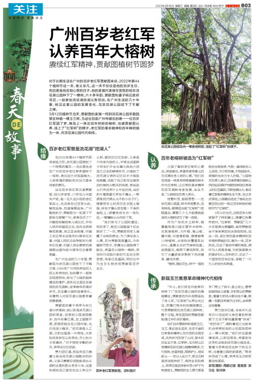 对于长期生活在广州的百岁老红军贾献图来说,2022年第44个植树节这一天,意义非凡。这一天不仅仅是他的百岁生日,而且更是他实现心愿的日子。他的家属代表身在医院的他在流花湖公园种下了一棵树。六十多年